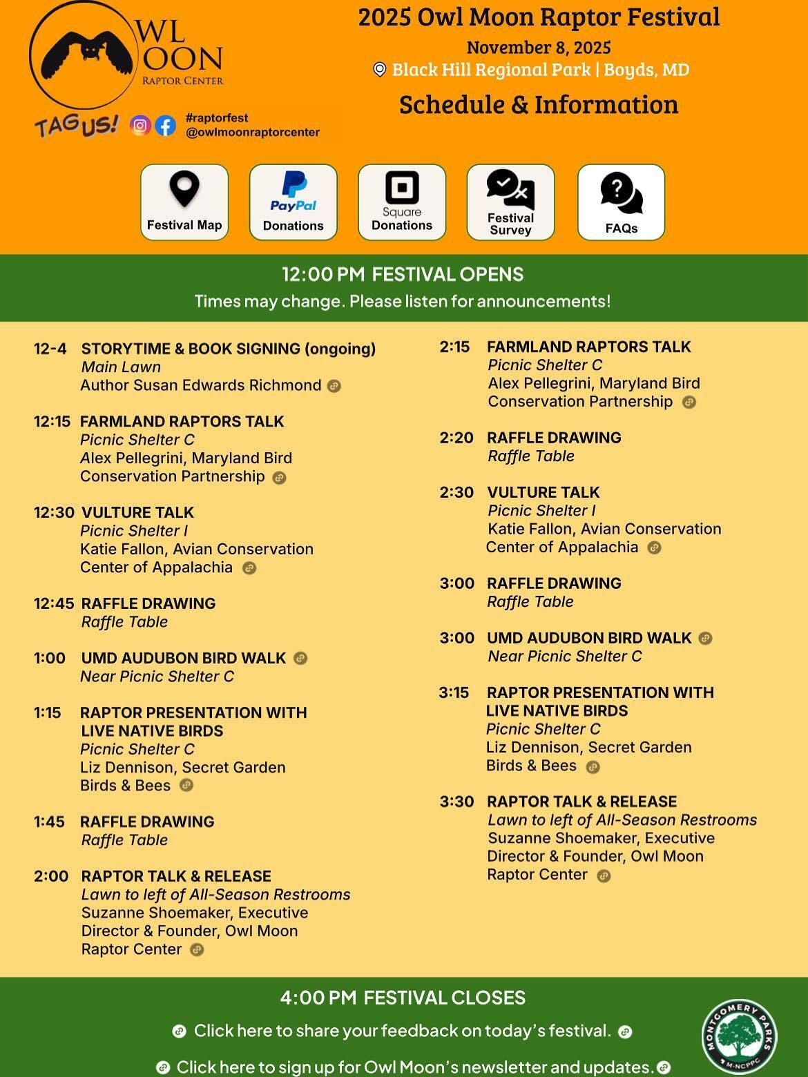 The 2025 Owl Moon Raptor Festival is only two days away! Join us at Black Hill Regional Park from 12-4 pm this Saturday, 11/8, to learn about birds of prey and see them up close. The event will feature releases of rehabilitated raptors (like this barred owl release from our 2024 festival), opportunities to see birds of prey from around the world, educational talks, book readings, and activities for the whole family. The schedule of events is available here: http://bit.ly/omrcfestival. Help us spread the word!